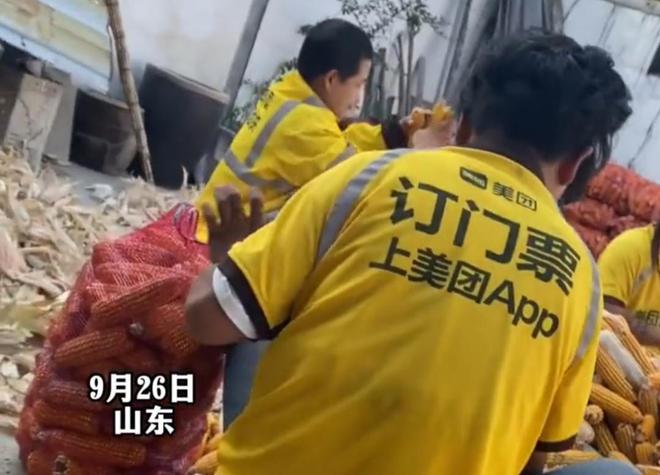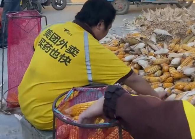 山东济宁一个女子,一个人在家里秋收,看着满院子的玉米发了愁,最后请来了三个外卖骑手来帮忙,自己悠闲地喝奶茶,看着骑手们收玉米。