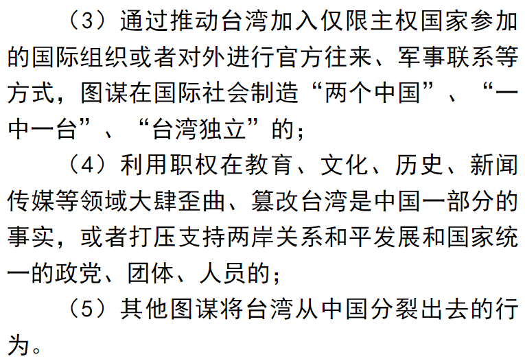 第2条里面的第2小条的内容为:通过制定、修改、解释、废止台湾地区有关规定或者“公民投票”等方式,图谋改变台湾是中国一部分的法律地位的;