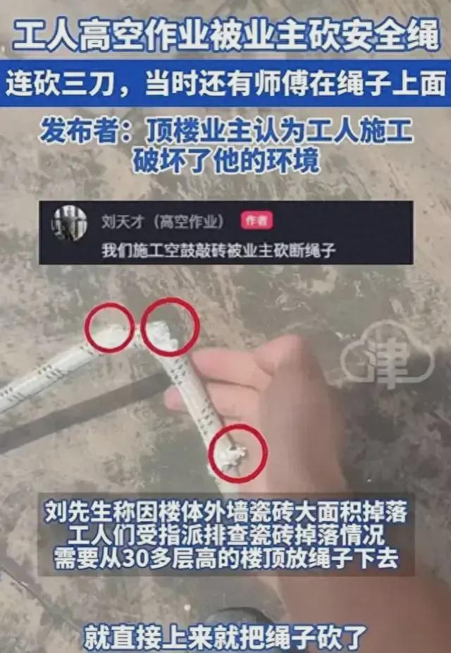 当时,工人们刚刚顺着安全绳开始下滑,突然一名业主跑到楼顶,带着工具毫不犹豫地把他们的安全绳给剪断了!这可真是令人瞠目结舌的行为。所幸的是,工人的安全绳是双绳系统,这才避免了可能发生的严重事故。想象一下,如果没有双绳保护,这四个人的安全就真是岌岌可危了,后果不堪设想!