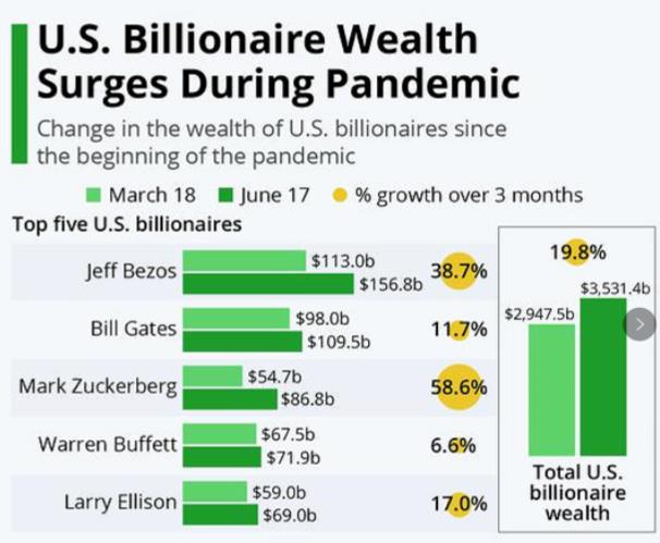 疫情期间,美国643位亿万富翁的总资产从2.9万亿美元增至3.5万亿美元,另有29个人加入了“万亿美元俱乐部”。亿万富翁们的集体财富增加了5840亿美元,但同时仍有约4550万美国人申请失业。