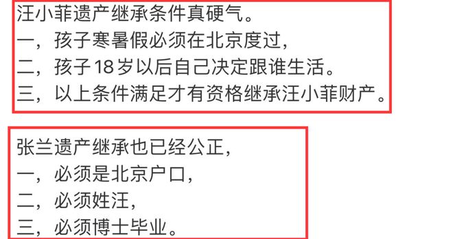 张兰也在直播间说过,自己已经做了遗产公证,成为她的遗产继承人必须满足三个条件:姓汪、北京户口、博士毕业。这三个条件往这一摆,就算是汪小菲本人,估计也得掂量掂量自己够不够格,很怀疑张兰这波到底是在刁难大S还是刁难自己儿子。