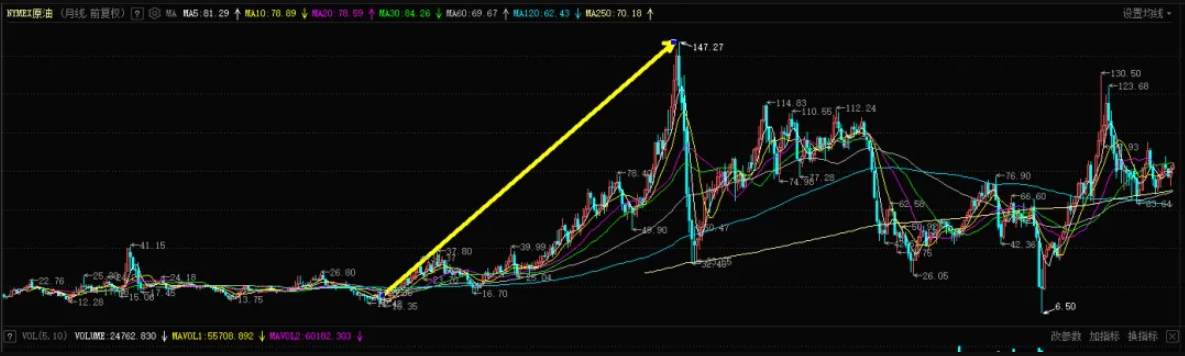 我就浅浅的放一下石油的价格走势图吧,画了黄线那一段就是1999年到2008年这一段原油大牛市,咱就是说,车轮上的美利坚,看着油价涨了8倍以上一声不吭的忍着通胀,坚持放任抄底利率好房价炒起来,这是怎样一种忍者神龟精神?