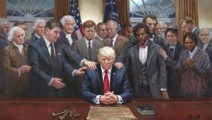 甚至出现了这张美国众多前总统和重要人物,一起站在特朗普背后保佑的图片