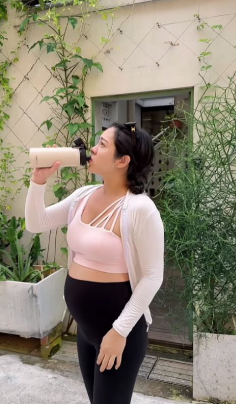近日陈芷尤分享了一段短片,她身穿瑜伽服和拖鞋,将近30周的巨肚非常明显。早前她更是穿着黑色三点式泳装,臃肿明显!