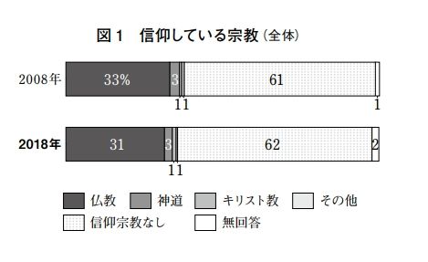 根据NHK广播电视文化研究所、ISSP国际社会调查计划在2019年发布的调查,显示仅有36%的日本人信仰宗教,比例相较其他国家来说偏低。