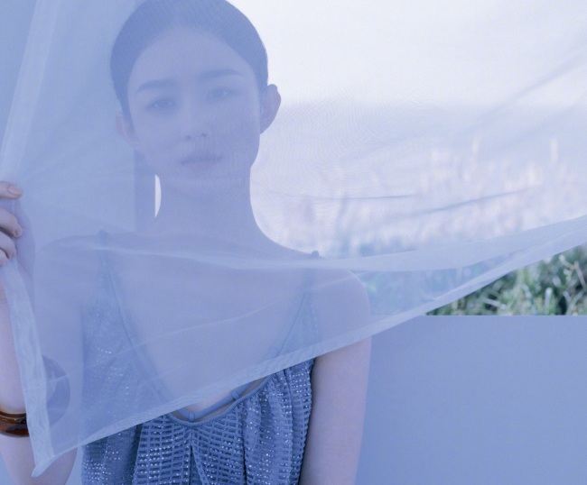 陈都灵一袭绿色抹胸长裙 站在柳树下宛若自然精灵