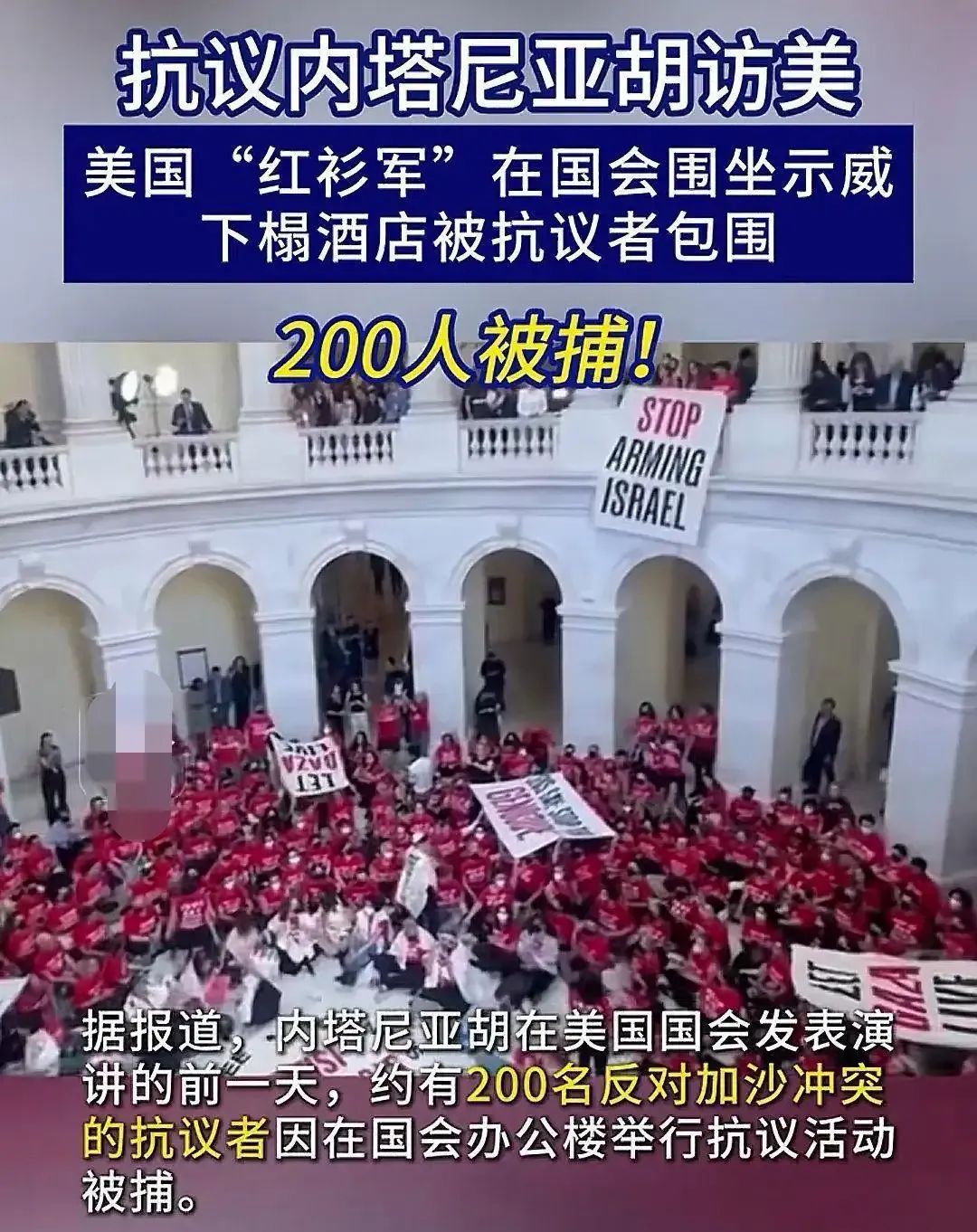 在国会大厦外,反对内塔尼亚胡的示威者数以千计。他们呼喊“解放巴勒斯坦”的口号,举着写有“逮捕内塔尼亚胡”“停止给以色列送军火”字样的标语。一些示威者在华盛顿联合车站外焚烧美国国旗,升起巴勒斯坦国旗。结果导致了军警的严厉镇压,200多人被捕。