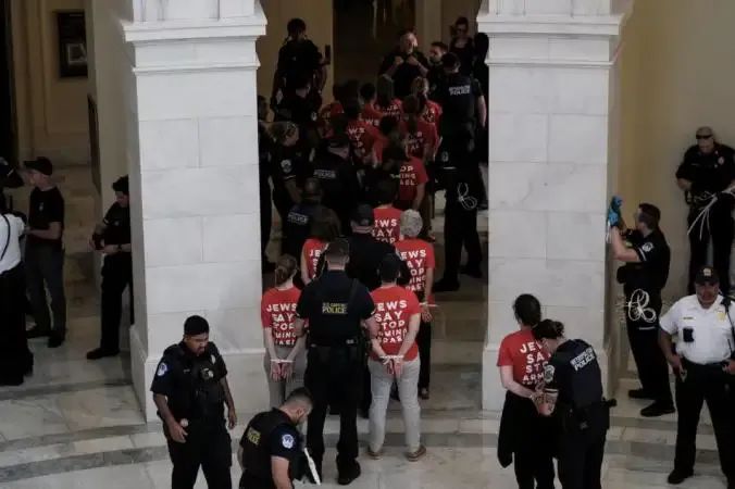 对了,这些被抓的人里面,有很大一部分就是美国的普通犹太人,很多人来自于"犹太和平之声组织",这是美国的一个反犹太复国主义组织,参加抗议活动的人包括犹太教拉比、学生、以色列裔美国人和大屠杀幸存者的后代。在一条横幅上,他们用希伯来语写着"修复世界"。