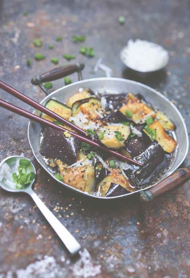 - 将茄子摆入盘中(先把酱汁保留起来)。撒上柴鱼片,放上磨碎的白萝卜泥和姜泥。再倒入1汤匙的酱汁,然后撒上葱花装饰。