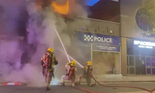 英格兰北部的桑德兰一栋警察局大楼就被纵火焚烧。
