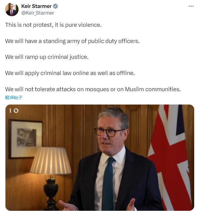 他还表示,针对穆斯林社区的暴力抗议者将很快面临法律“全面制裁”。“无论表面上的动机是什么,这都不是抗议,而是纯粹的暴力,我们不会容忍针对清真寺或穆斯林社区的袭击。”他说,“所有被确认参与其中的人都将受到法律严惩。”