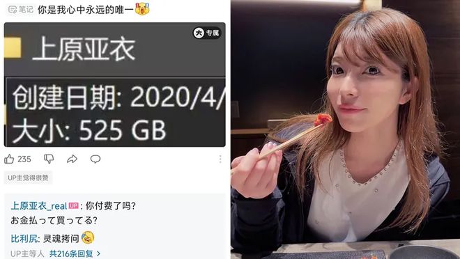 这名中国粉丝po出电脑中用来存储上原亚衣作品的资料夹,从2020年4月开始,目前已经有525GB容量的上原亚衣作品。但上原亚衣直接回应问道:「你付费了吗?」