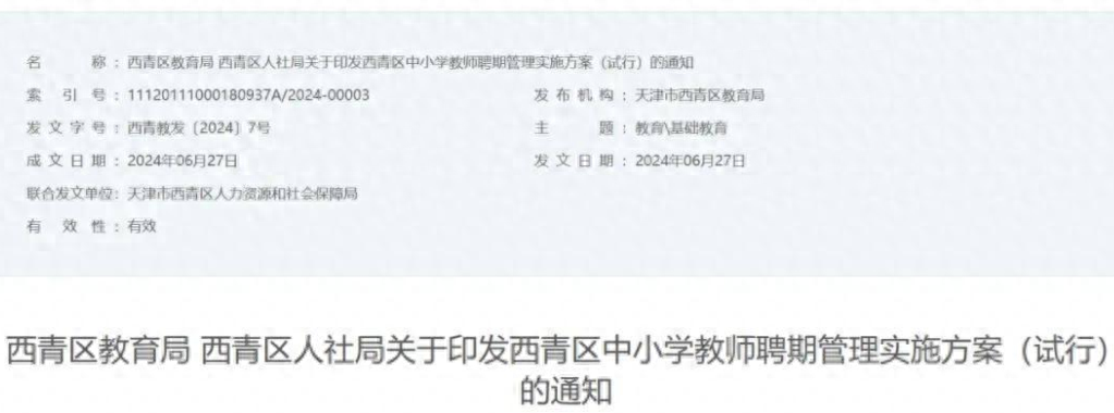 6月27日,天津市西青区教育局、西青区人社局联合印发了《西青区中小学教师聘期管理实施方案(试行)》在方案中明确:全面实行中小学教师聘用制度和岗位管理制度,打破“一聘定终身”,对中小学教师职称聘任实施动态管理,构建人员能上能下、能进能出的灵活用人机制;该政策适用范围为(西青区)公办中小学校、幼儿园、特殊教育学校中在编从事教育教学的教师(含双肩挑人员和兼任管理工作的教师)。