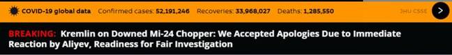 【环球网报道】当地时间9日,俄军一架米-24直升机在亚美尼亚叶拉斯赫镇附近遇袭坠毁。随后阿塞拜疆外交部发表声明,承认阿方意外击落俄军的一架米-24直升机,向俄方道歉并表示愿意赔偿。据俄罗斯卫星网刚刚最新消息,克里姆林宫13日表示,由于阿塞拜疆总统阿利耶夫立即对此作出反应,并表示愿意进行公平调查,俄方接受阿方道歉。