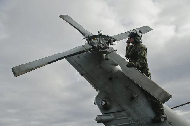 看了这些伸缩脚踏,再看看他们怎么维护尾桨的图片,身穿绿上衣绿马甲的维护地勤人员,爬上高高的直升机尾梁,仔细的给尾桨进行维护保养,细节满满。