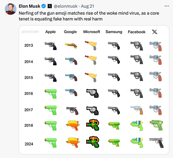 8月21日,马斯克在X上发文展示手枪表情符号的变迁。 X平台截图
