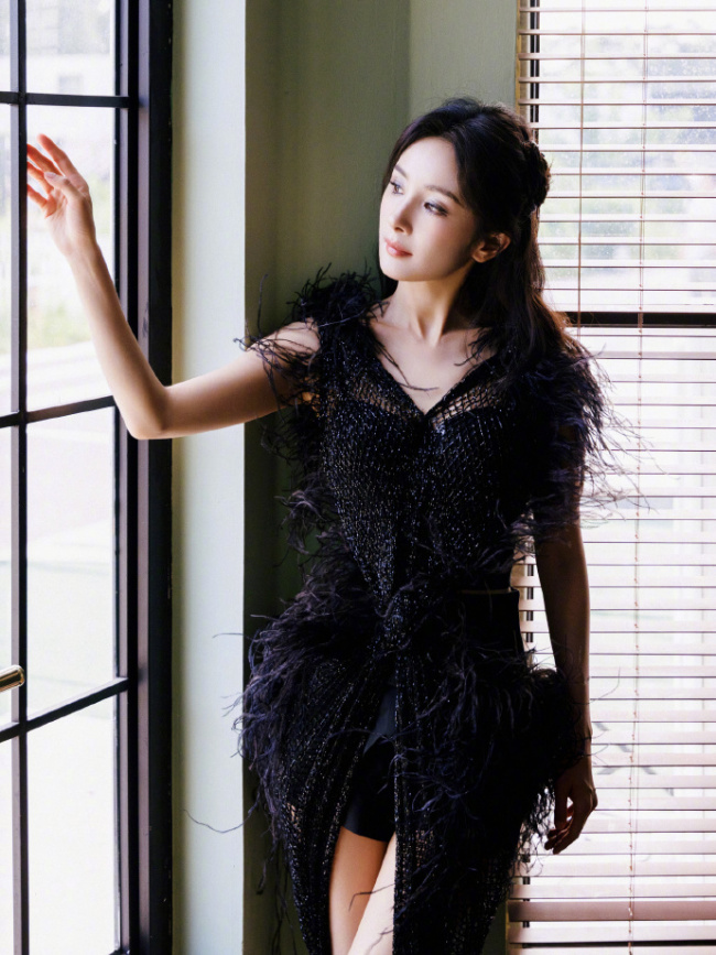 近日,杨幂工作室发布了一组杨幂的写真照片。照片中杨幂身穿黑色羽毛裙,裙子设计新颖,仿佛黑天鹅一般,美丽动人,优雅妩媚。