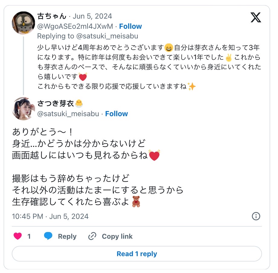 经纪公司マインズ(Mine’s)所属的企划女演员「さつき芽衣(沙月芽衣)」是在X上迎接出道4周年(2020.7~)的同时宣布暗黑引退ー之所以特别强调是暗黑引退是因为她就只是不拍片了,还是会继续接活动的〜