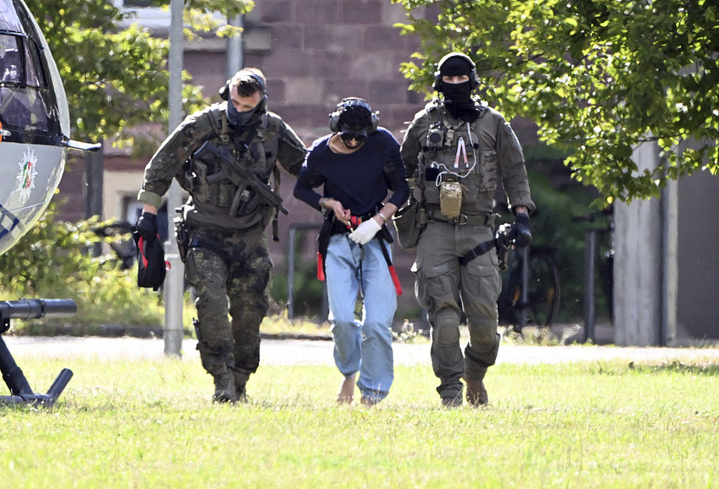 当地时间8月25日,德国索林根市持刀袭击事件嫌疑人被警方拘押。 视觉中国