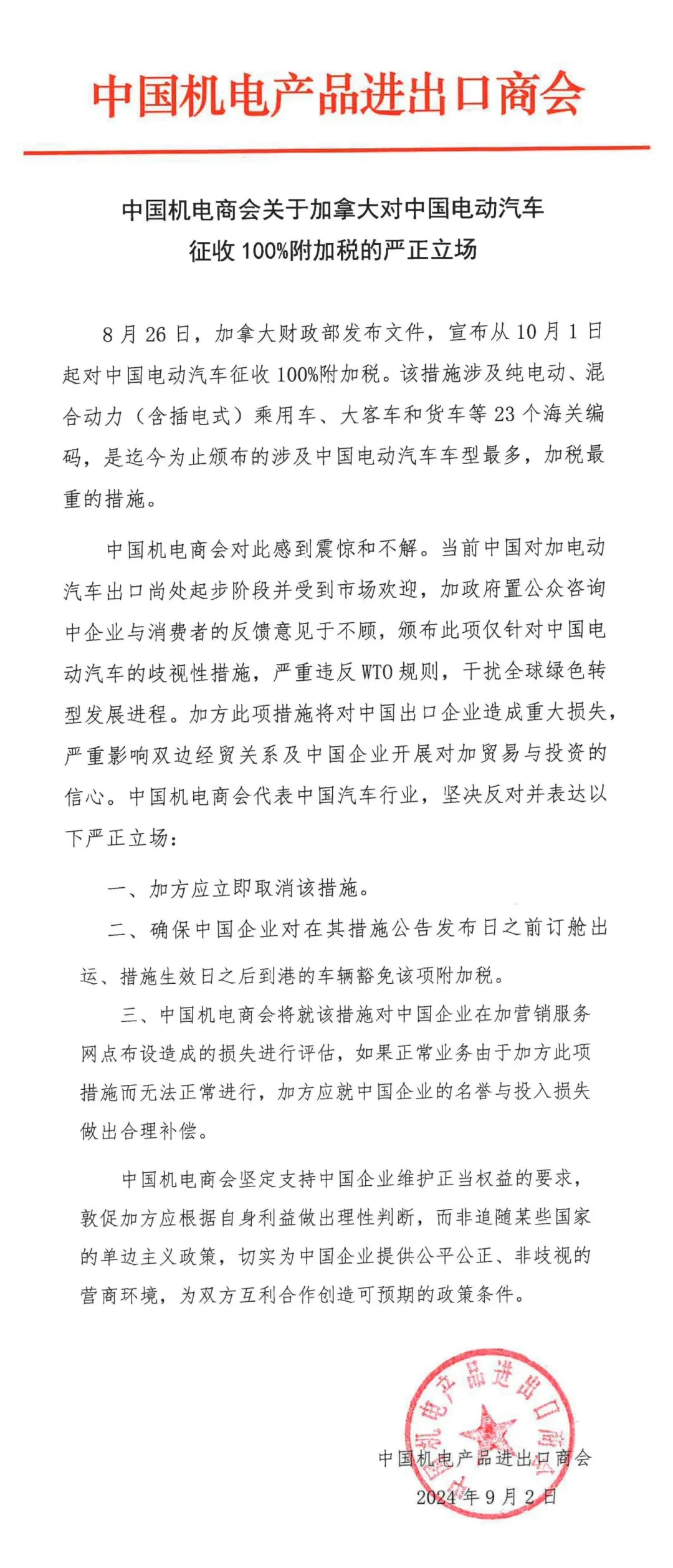 9月2日,“中国机电产品进出口商会”公众号发布立场文件称,中国机电商会针对“加拿大对中国电动汽车征收100%附加税”一事,表示坚决反对,敦促加方做出理性判断,立即取消该措施。中国机电商会将就该措施对中国企业造成的损失进行评估,坚定支持中国企业维护正当权益的要求。