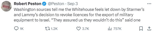 英暂停向以出口部分武器,外媒:白宫很失望,称英国“出尔反尔”