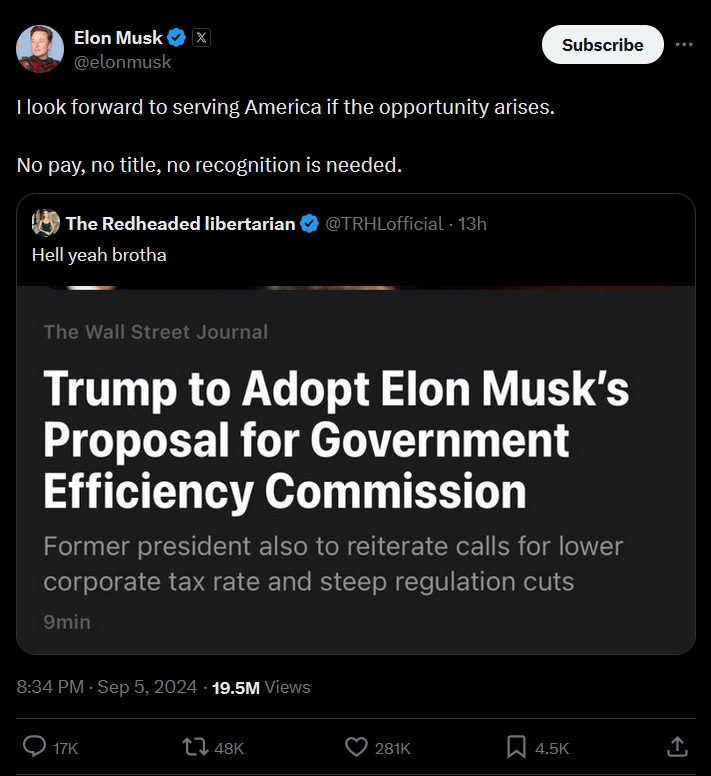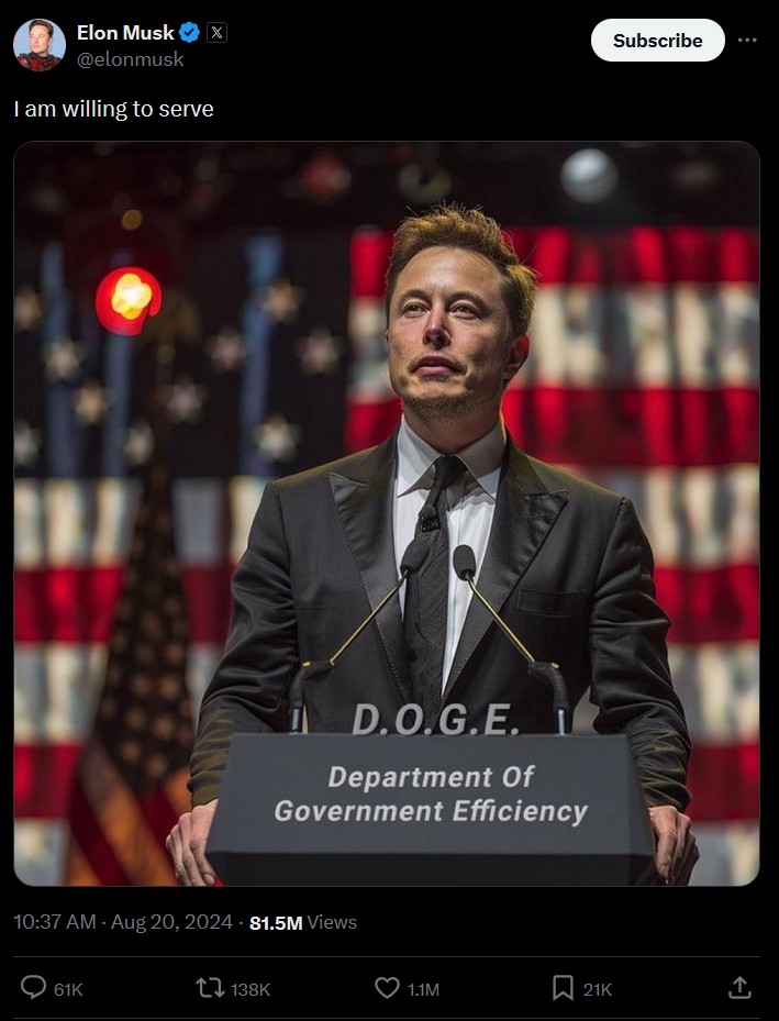 8月12日,马斯克在X上进行对特朗普的访谈,再次提到此事。特朗普当时表达了称赞,并在几天后表示,马斯克可能会在他的政府中获得一项职务。19日,马斯克发布了一张人工智能(AI)生成的图片回应,图片上的他站在一个标有“政府效率部”的讲台上,并配文说“我愿意效劳”。