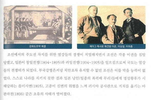 在介绍日本侵夺主权的这一章中,称当时的日本“通过明治维新这一近代化,在短期内实现了富国强兵”。而对于朝鲜王朝则这样介绍道,“列强为了在韩半岛占据主导权,竞争越来越激烈,各种利益受到了侵犯,日本发动了清日战争(1894~1895年)和日俄战争(1904~1905年),朝鲜半岛成为列强的战场。别说富国强兵,连治安都无法维持的朝鲜无力阻止战争。”