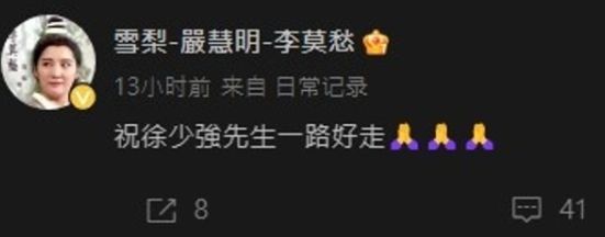 想不到徐少强在73岁时过早离世,而太太更是随之去世!旧爱雪梨曾公开表示自己看错人并表示“已经Delete了这个人”,对于徐少强的离开,雪梨今天上午社交网留言:“祝徐少强先生一路好走” 多年爱恨随着徐少强的去世也彻底抛开。
