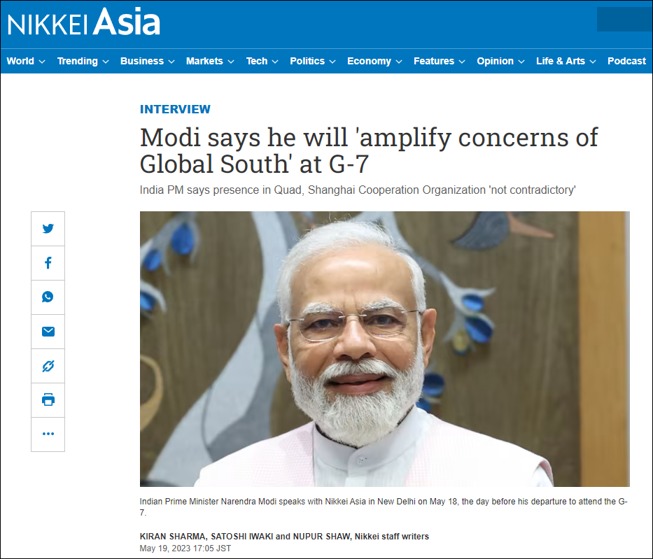 【文/东方军事 熊超然】当地时间5月19日至21日,七国集团(G7)领导人峰会将在日本广岛举行。在19日飞抵日本的前一天,印度总理莫迪在其位于新德里的总理办公室,接受了《日经亚洲》(Nikkei Asia)书面形式和以面对面形式结合的独家对话,议题涵盖诸多方面。