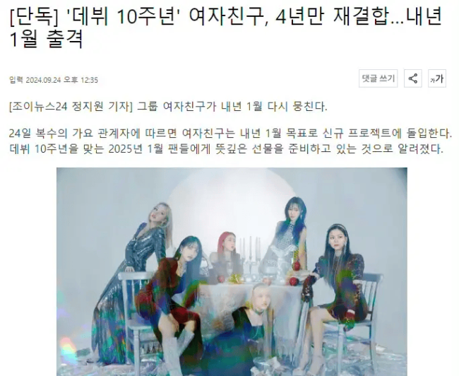 据韩媒报道,有多位音乐界人士透露女团GFRIEND时隔4年将于明年1月重组出击。据悉,2025年1月是GFRIEND出道10周年,成员们想为粉丝准备一份有意义的礼物。