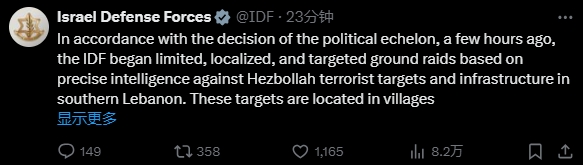 以色列国防军在社交媒体X平台发布的声明中称,以军针对的是黎巴嫩真主党位于黎巴嫩南部、靠近黎以边境村庄的目标和基础设施,还称这些目标“对以色列北部社区构成直接威胁”。目前,以色列空军和炮兵正在对该地区军事目标进行精确打击,以支援地面部队进攻。