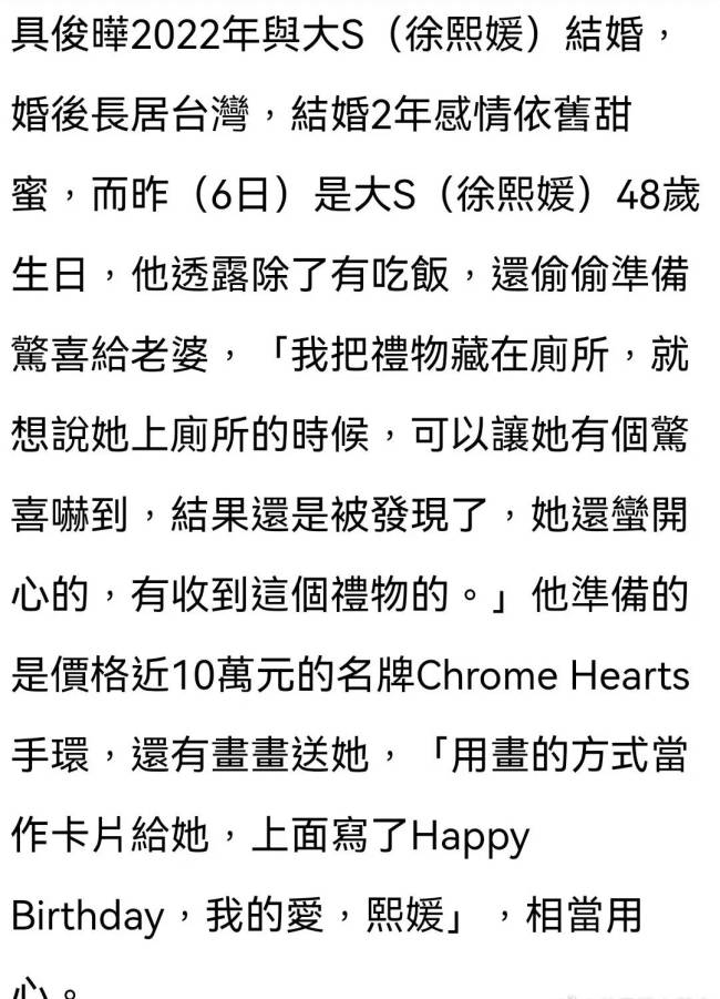 近日,具俊晔准备名牌手环以及手绘画作为大S庆生,却将生日礼物藏在厕所。对此,大S透过经纪人回应:“万万没想到,连我这个惊喜破解王都感动到了,不过惊喜归惊喜,还是忍不住捶了他两拳!”
