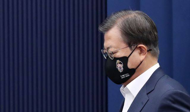 原标题:文在寅戴卡通口罩开会 上面写“清廉”二字