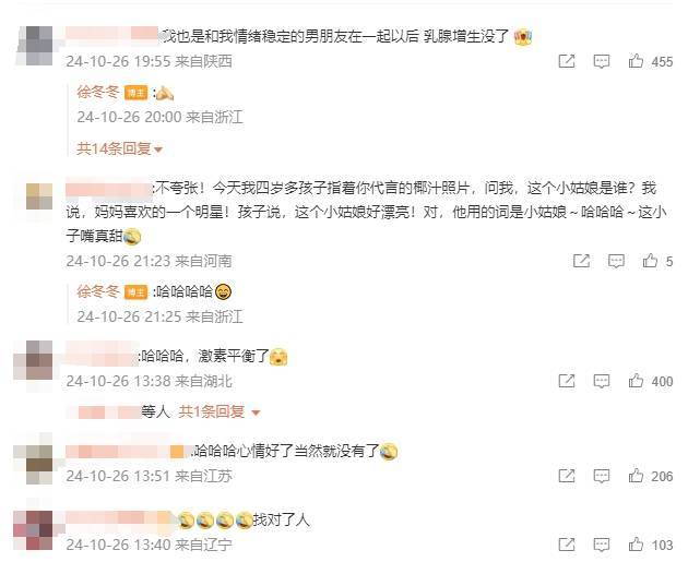 还有网友分享了和徐冬冬类似的情况:“我也是和我情绪稳定的男朋友在一起以后,乳腺增生没了!”