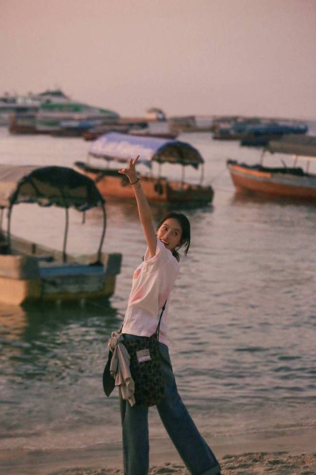 宋茜海边看落日氛围感拉满 穿白T牛仔裤简单又温柔