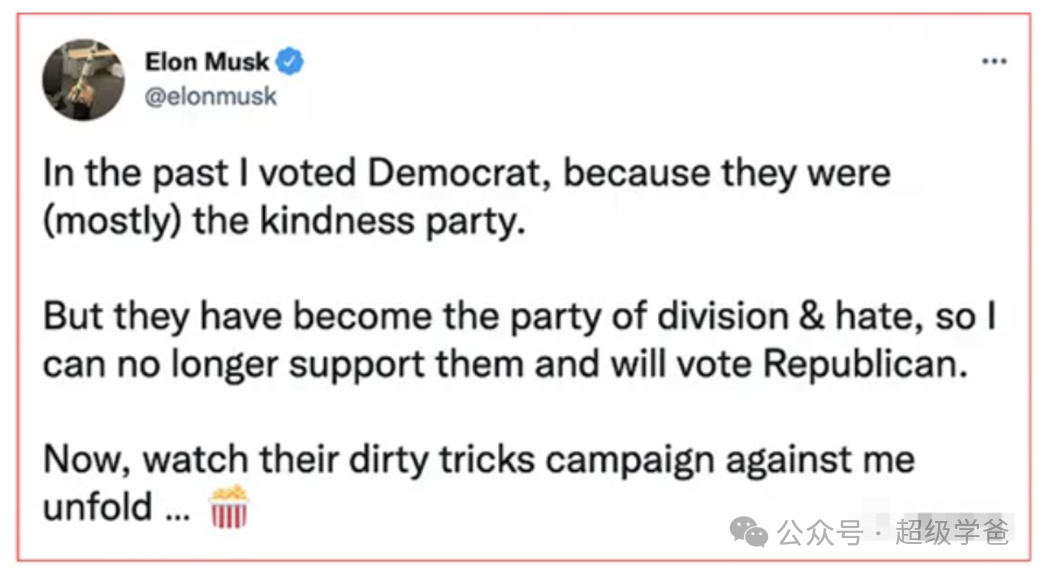 几个月后的5月19日,马斯克发布推特,正式与民主党决裂,将改投共和党,说他们已变成分裂及仇恨的政党,因此无法再支持他们。现在,看着他们的肮脏手段展开吧。