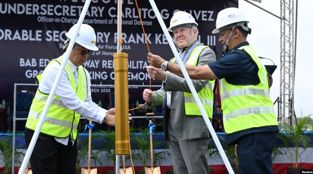 2023年3月20日,菲律宾国防部长加尔维斯、美国空军部长弗兰克·肯达尔和一名菲律宾空军代理指挥官在菲律宾巴萨空军基地举行简易机场扩建和修复项目的奠基仪式。路透社