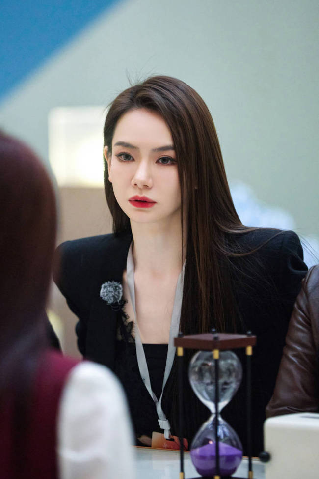 戚薇身穿一身黑色西装化身职场佳人,气场强大,美貌抢眼。