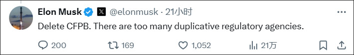 马斯克在社交媒体上呼吁撤销美国消费者金融保护局