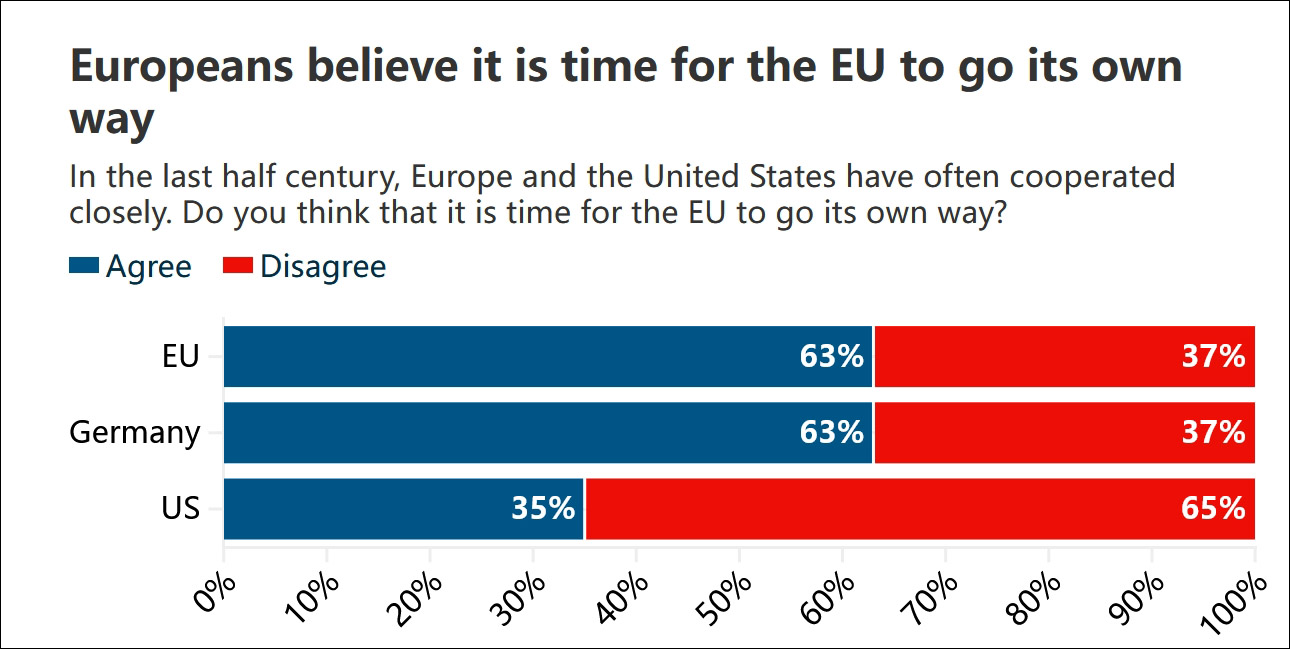 除波兰外,大多数(63%)欧洲人认为欧盟应该减少与美国的合作,走一条独立的道路。这一观点在外交政策中尤为强烈,73%的受访者希望欧盟发挥更积极的作用。