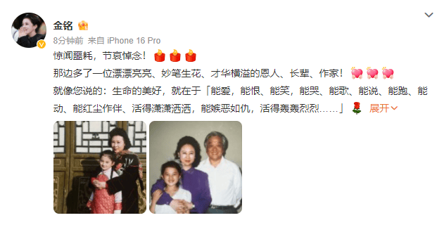 金铭发文悼念琼瑶:在那边和平伯伯开开心心的