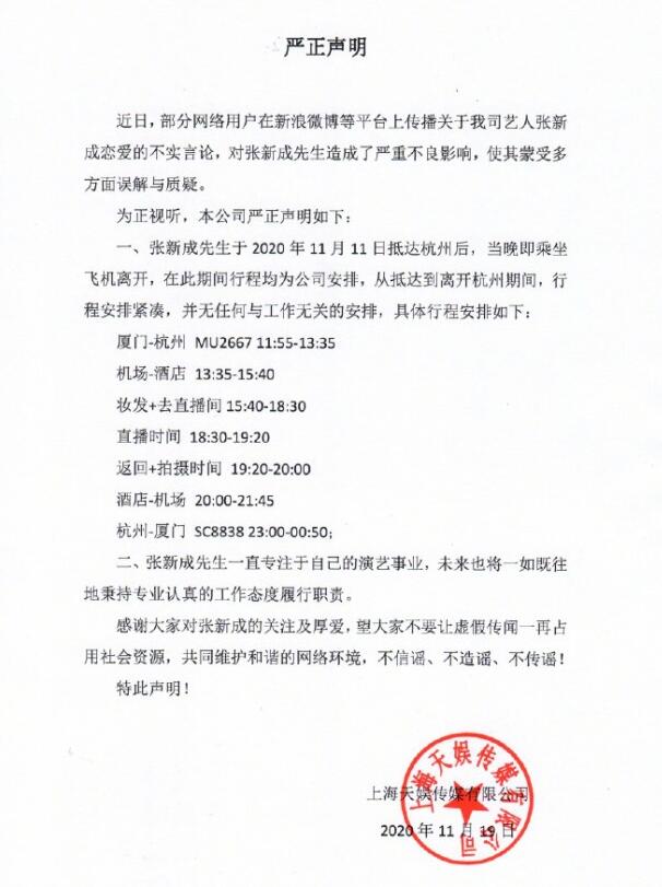 张新成恋情传闻被发酵了一天,张新成的经纪公司天娱传媒发律师声明表面态度,称近日部分网络用户传播关于张新成恋爱的不实言论,对其造成严重不良影响,使其蒙受多方面误解与质疑,并公开张新成相关的具体行程佐证,并呼吁大家不信谣、不传谣、不造谣。