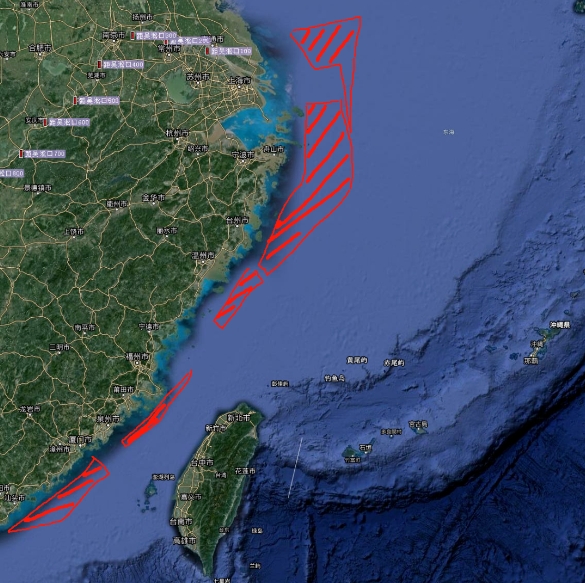 可见,除了几个重要空港的民航航线以外整个台湾海峡及东部沿海外海空域已经全部布控。这一区域内有上海(浦东、虹桥)、宁波、杭州、温州、福州、厦门等重要空港,划设如此大范围的管控空域是前所未有的。