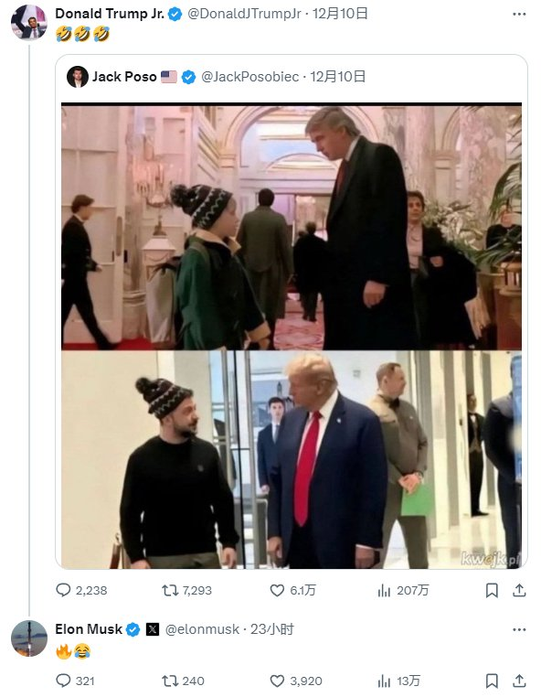 恶搞图片随后被特朗普的长子小特朗普和马斯克配上“笑哭”表情包转发,引发评论区哄笑一片。