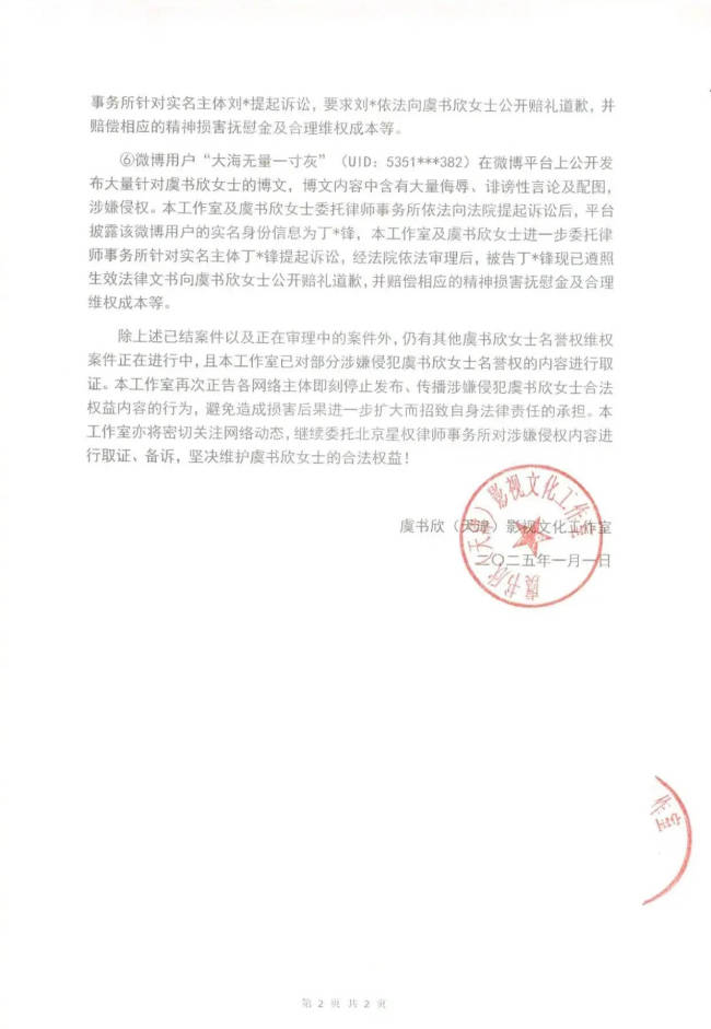 1月1日,虞书欣工作室发布了告黑进展说明,说明中列指出有用户持续对虞书欣进行诽谤,抹黑,诋毁,严重影响了虞书欣的个人声誉。工作室将积极通过法律渠道来进行维权。