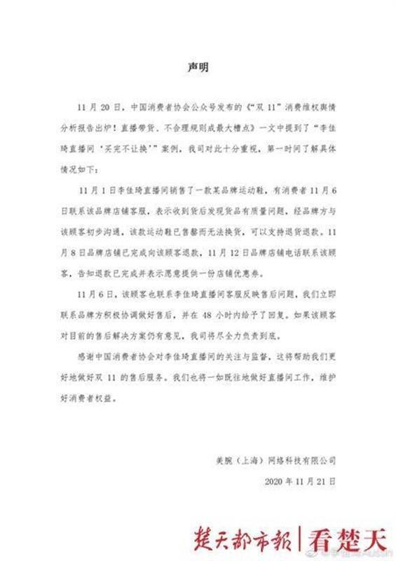 21日晚,李佳琦通过微博发布声明称,“佳琦直播间一向重视售后服务。经了解,品牌方已与该顾客初步沟通,因该款运动鞋售罄而无法换货,支持退货退款,并于11月8日完成向该顾客退款。此前,佳琦直播间客服也立即联系品牌方积极协调做好售后,并在48小时内给予了回复。佳琦欢迎社会各界的监督,我们将一如既往地做好直播间工作,维护好消费者权益。”