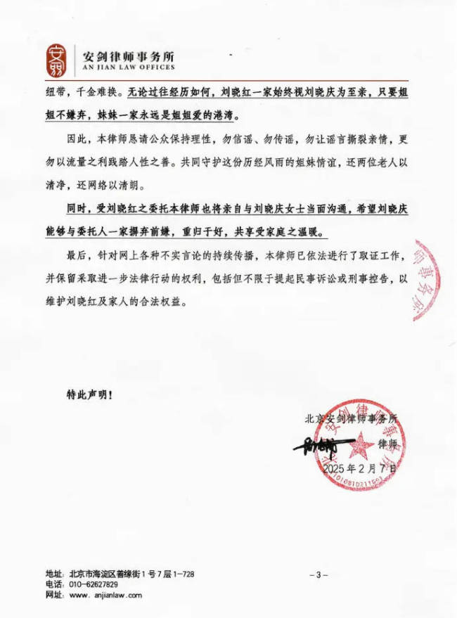 2月7日,有名为“周兆成律师”的账号在社交平台发布《关于刘晓红与姐姐刘晓庆不实谣言的律师声明》。声明否认了网络谣传的“吸血家族”“财产侵占”等言论。