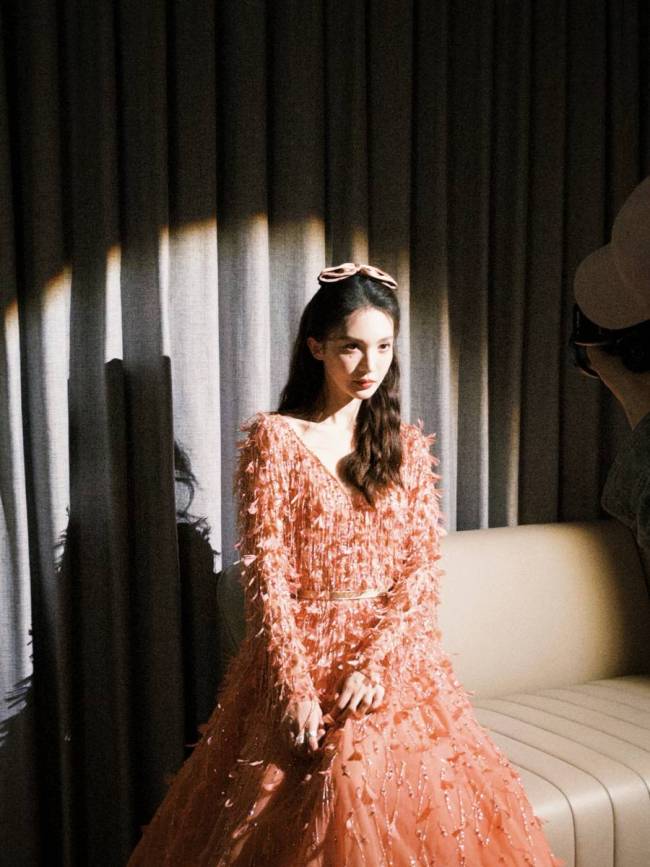 金晨粉色深V羽毛裙身姿曼妙 头戴蝴蝶结少女心满满