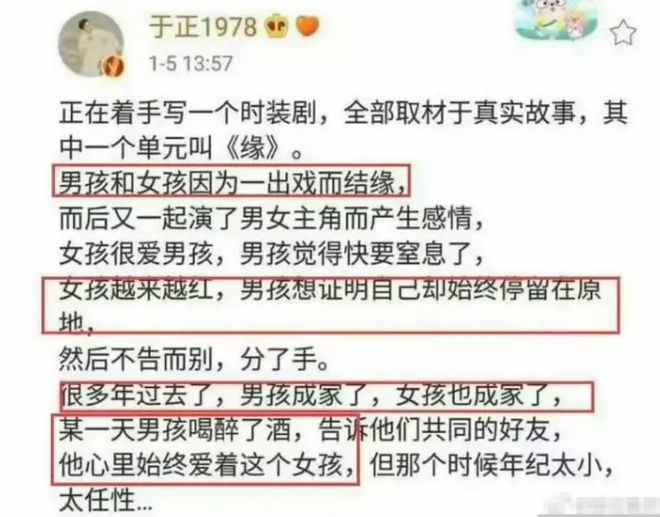 有网友挖出若干年前,于正发的一篇小作文,讲述了一对男女因戏结缘,但因为女方越来越红,双方差距越来越大,所以渐行渐远,后来双双有了家室,但男方一直对女方念念不忘,只是当时年纪太小太任性。当时就有人说于正是在影射赵丽颖、陈晓、陈妍希,直到现在依旧惦记着赵丽颖。