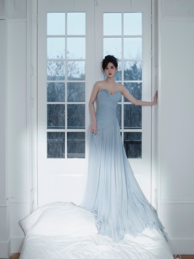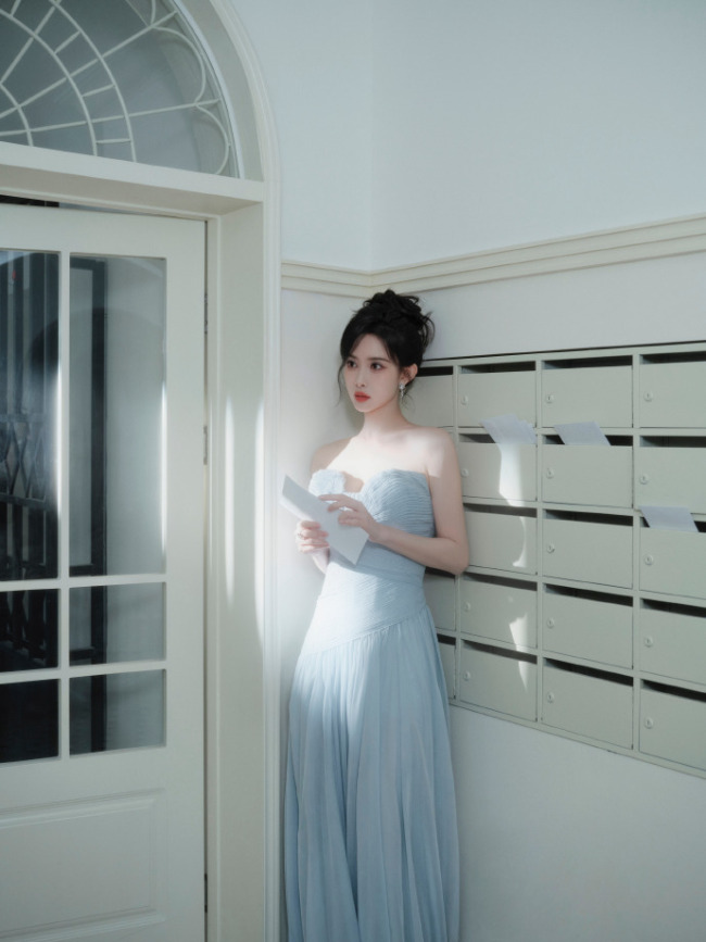 近日,孟子义参加活动的路透图释出。她穿着蓝色抹胸长裙,清新优雅,身姿曼妙。